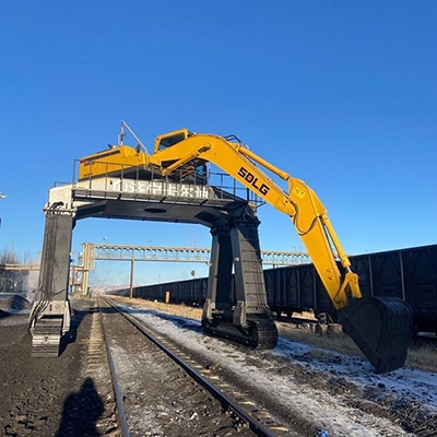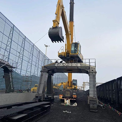 適用范圍:適用于火車、貨車裝卸料,在挖 掘機底盤上加裝四個高腿,橫跨在車廂上,增加作業(yè)高度范圍。